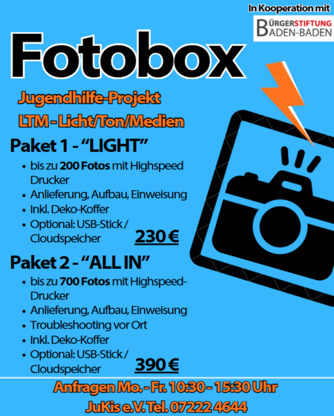 Die Bürgerstiftung Baden-Baden hat in Kooperation mit der JuKi e.V. sich eine Fotobox angeschafft, um gemeinnützige Veranstaltungen zu unterstützen.